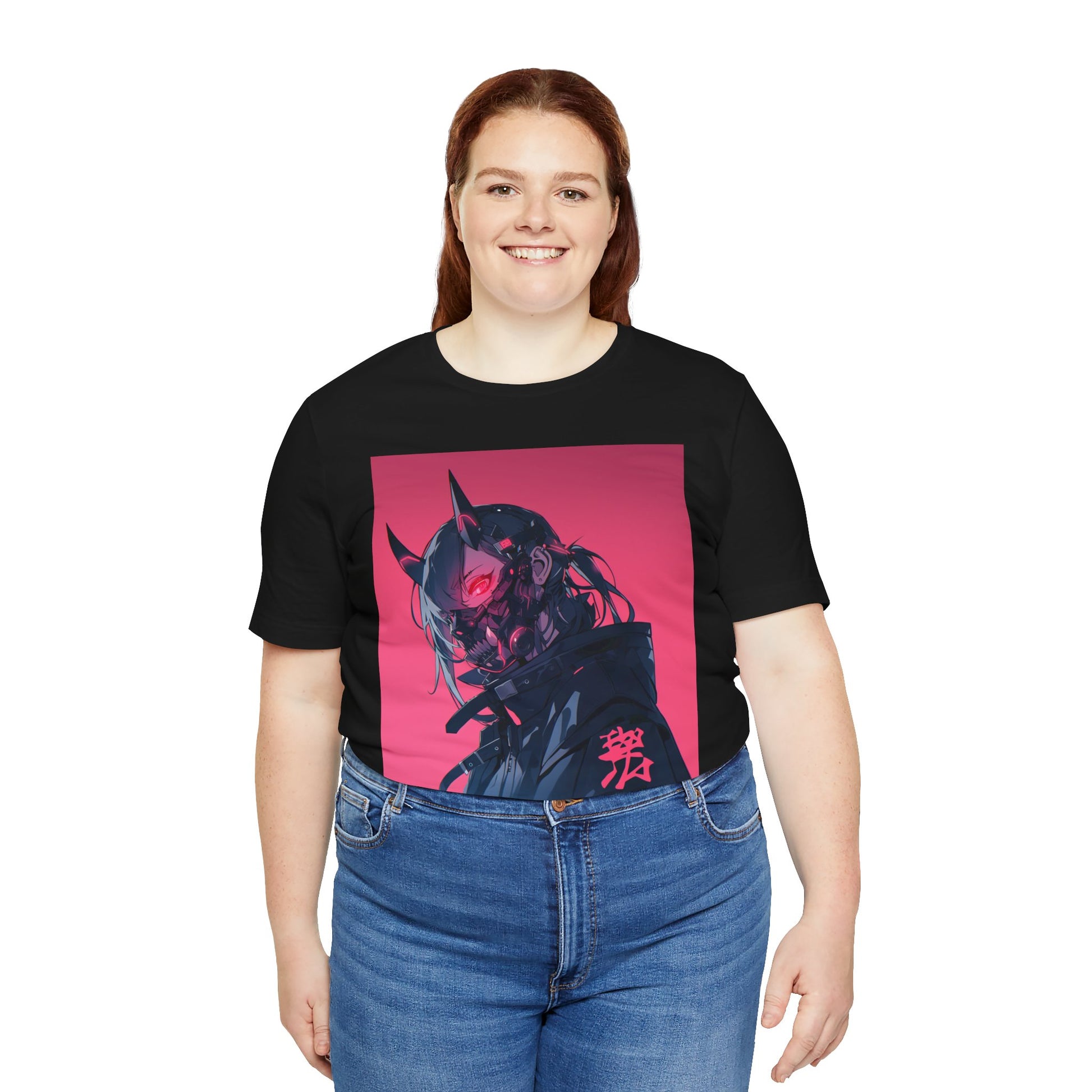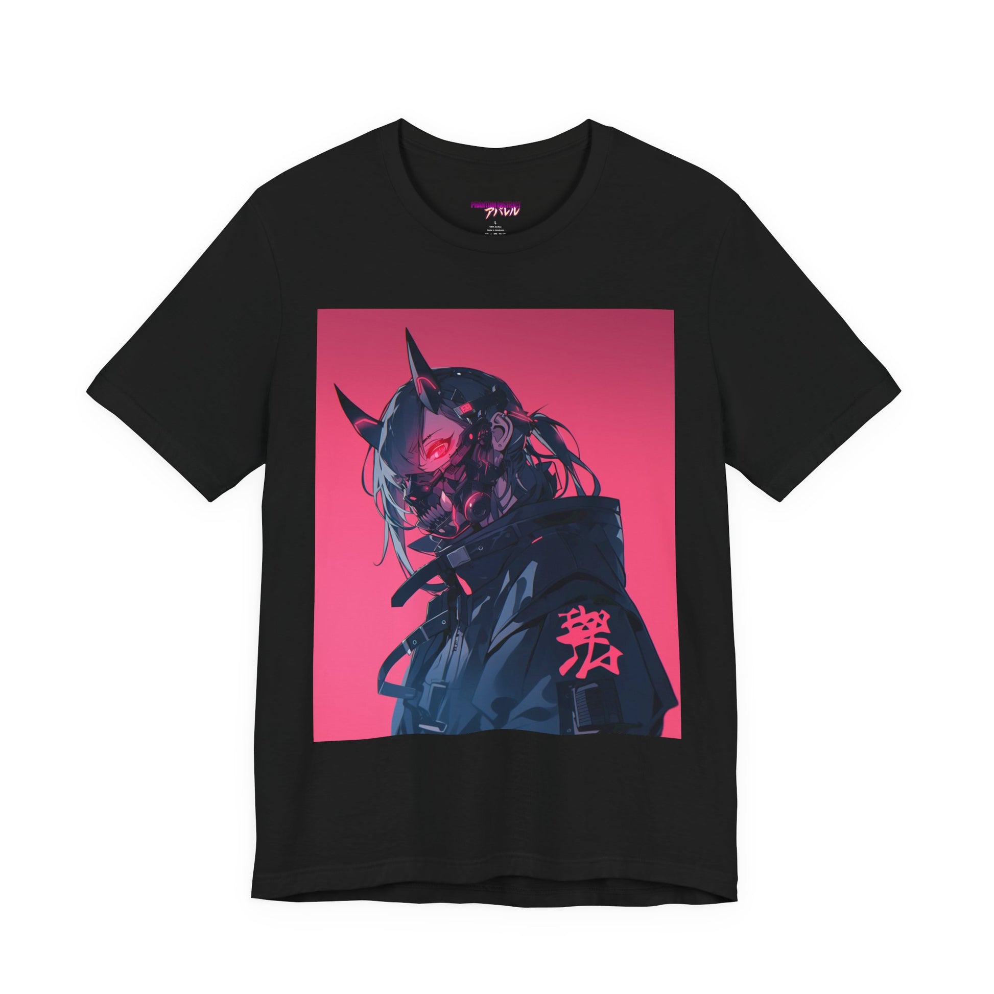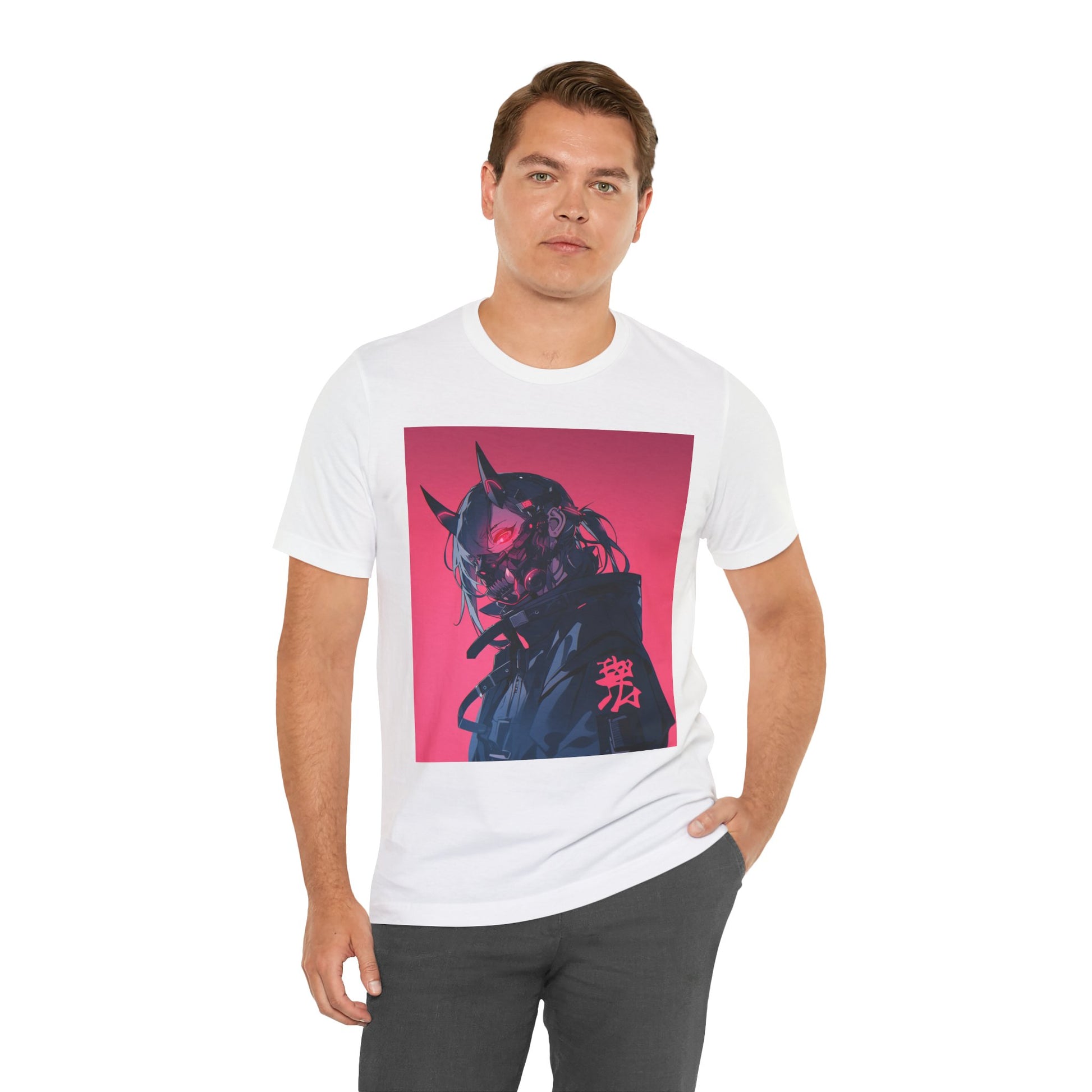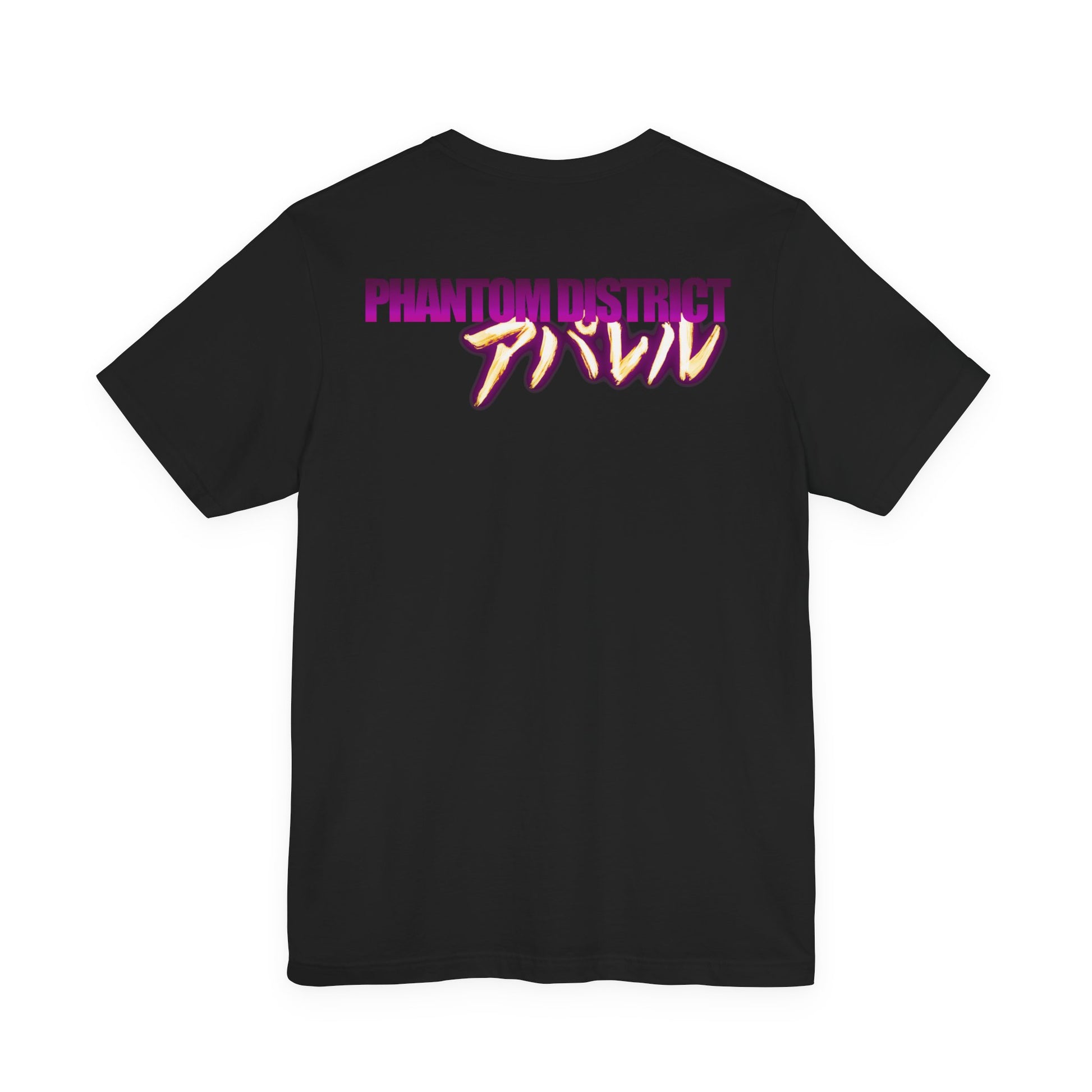 This lightweight jersey tee turns a streetwear staple into a statement piece — a cyber-oni figure rendered in sharp magenta and indigo, glowing like it stepped out of a neon back alley. The artwork sits clean and bold on the chest, while the back carries the Phantom District mark with brush-stroke katakana for a hit of modern Tokyo energy. Made with breathable Airlume combed cotton, the fit stays soft, structured, and ready for long nights, conventions, or layered city outfits. Durable construction details keep the silhouette tight wash after wash, giving this piece the longevity your rotation deserves.