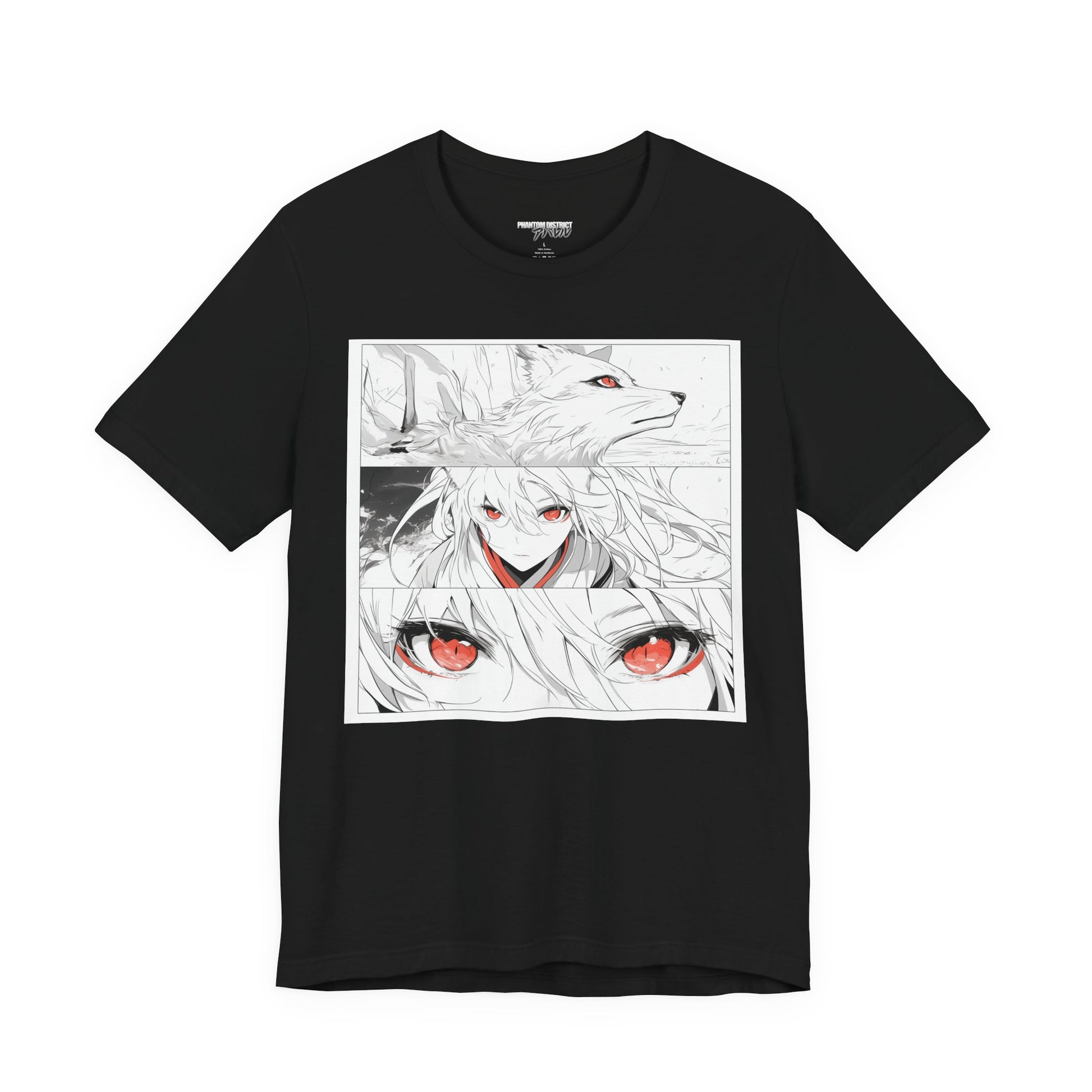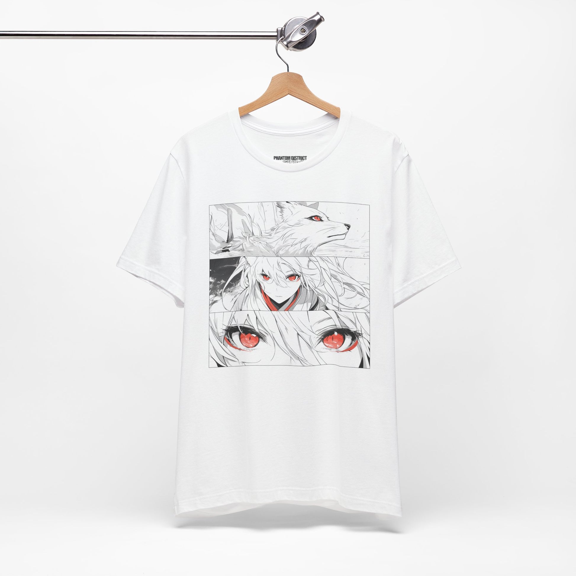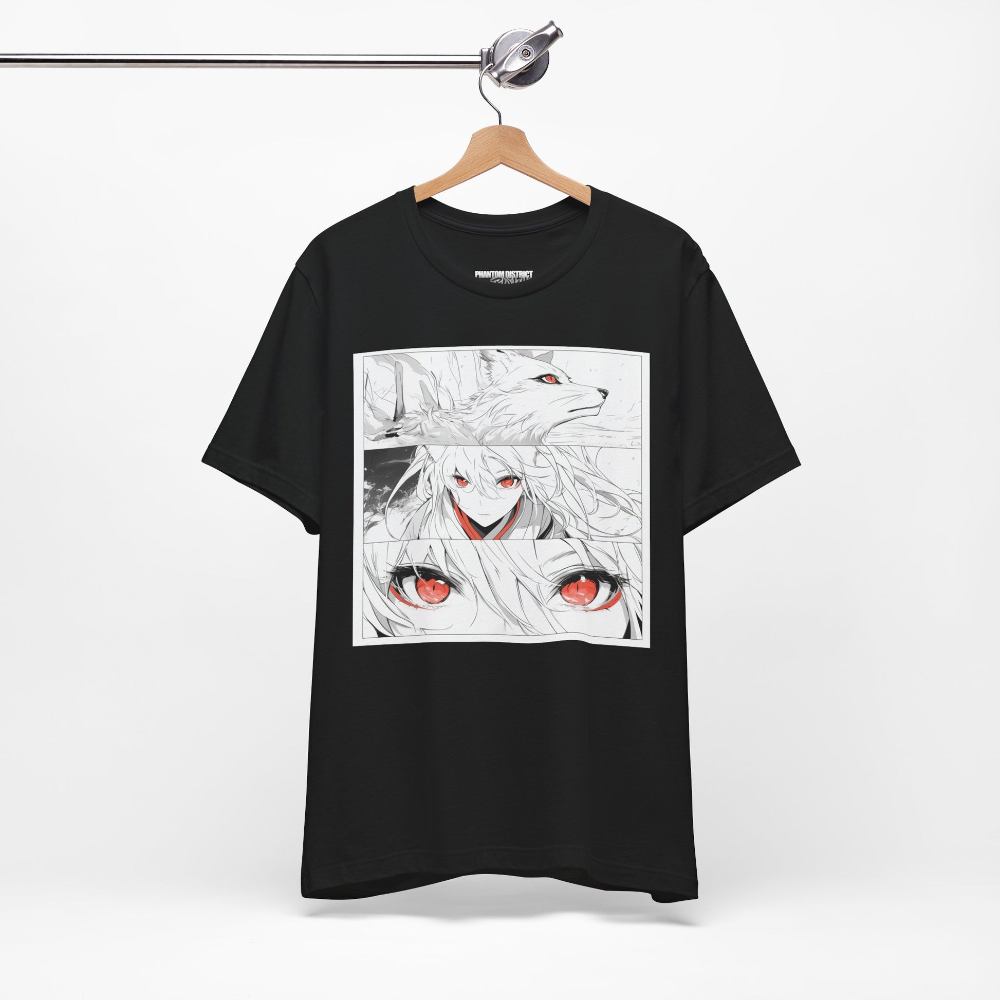 A lightweight, breathable tee built for fans of anime streetwear, fox-spirit aesthetics, and bold manga linework. The front features a high-contrast illustration of a wolf-spirit and piercing red eyes, framed in crisp panel-style composition for a cinematic, Japanese-inspired look. The back carries the signature PHANTOM DISTRICT wordmark with stylized Japanese characters — a clean, urban accent that pairs effortlessly with jackets, cargos, or layered fits.