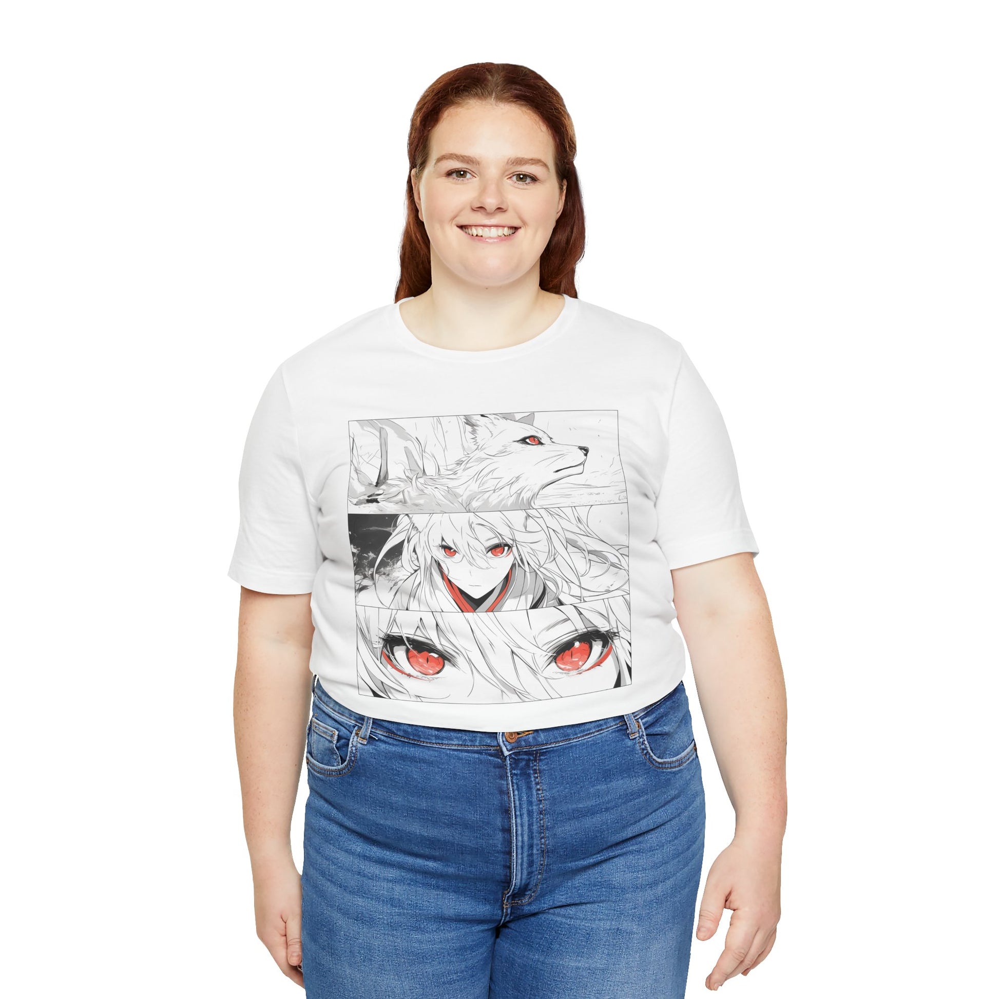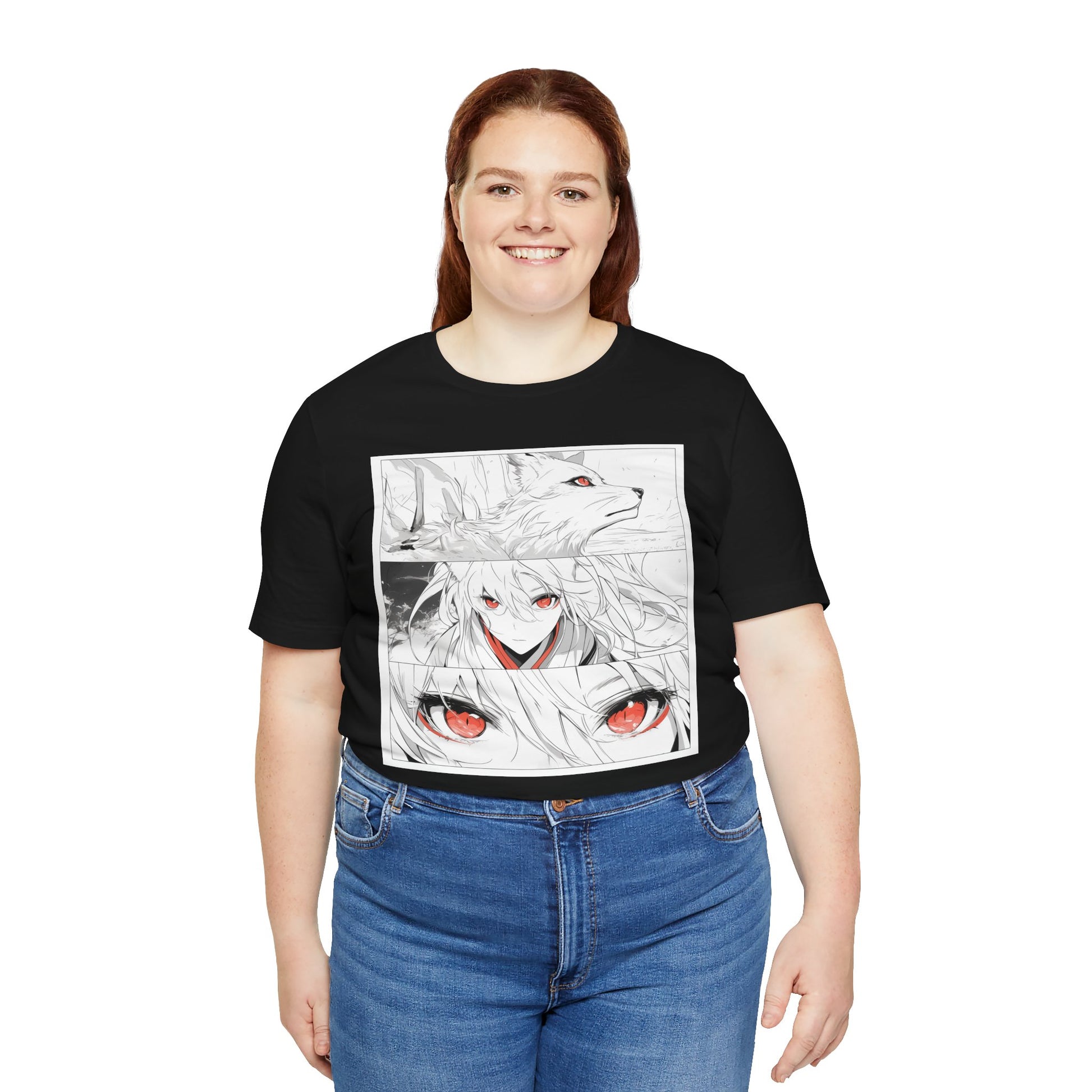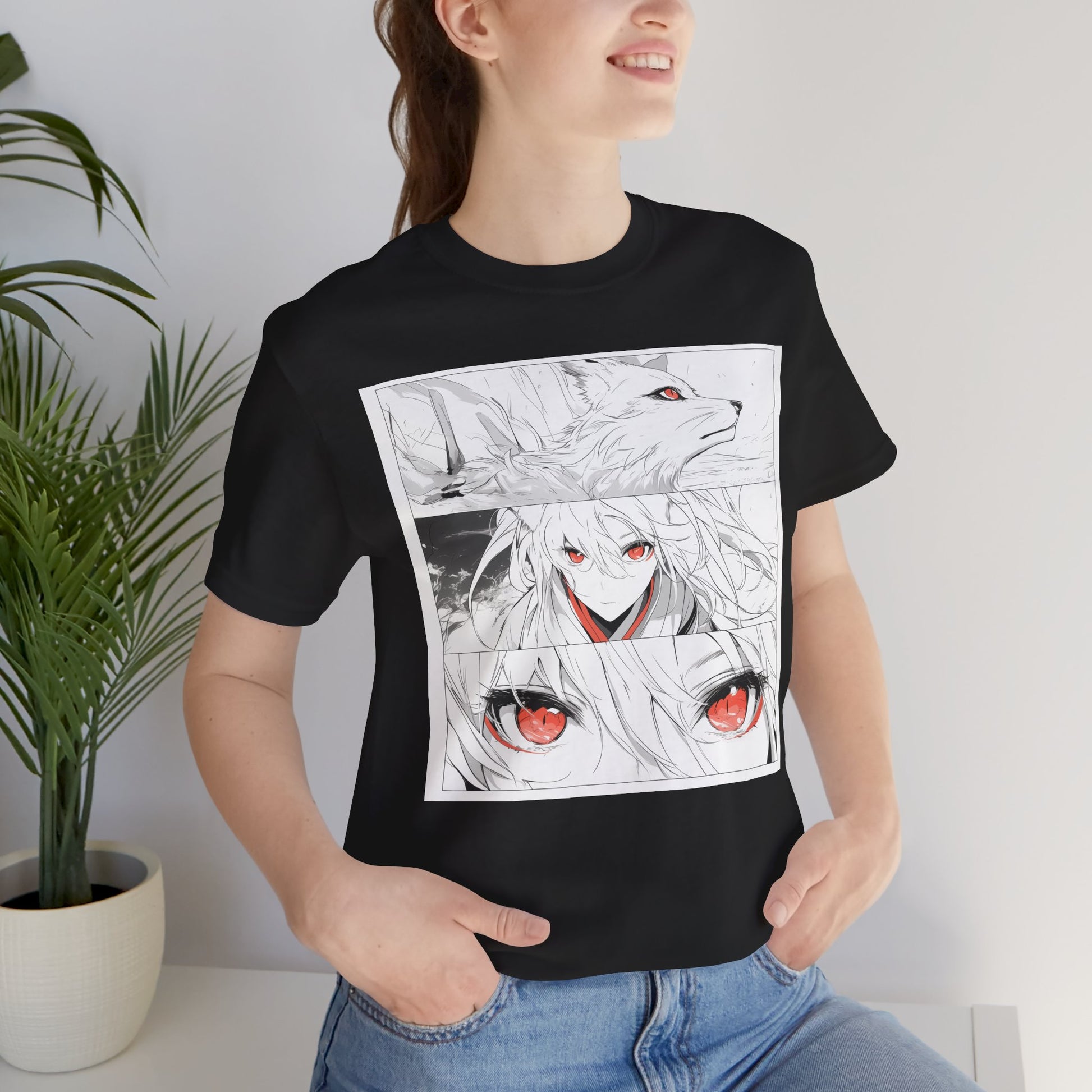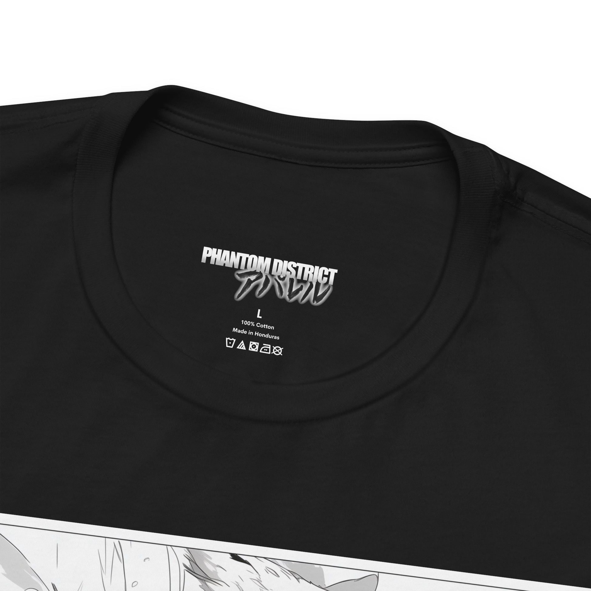 A lightweight, breathable tee built for fans of anime streetwear, fox-spirit aesthetics, and bold manga linework. The front features a high-contrast illustration of a wolf-spirit and piercing red eyes, framed in crisp panel-style composition for a cinematic, Japanese-inspired look. The back carries the signature PHANTOM DISTRICT wordmark with stylized Japanese characters — a clean, urban accent that pairs effortlessly with jackets, cargos, or layered fits.