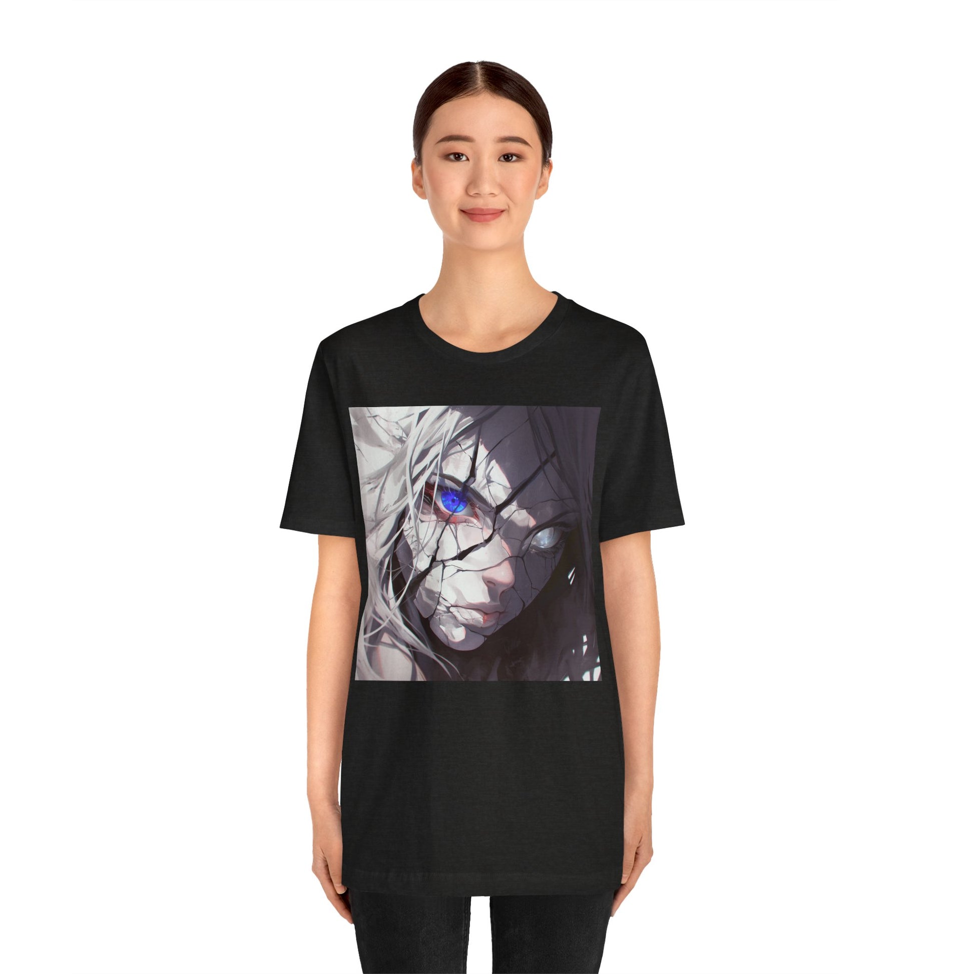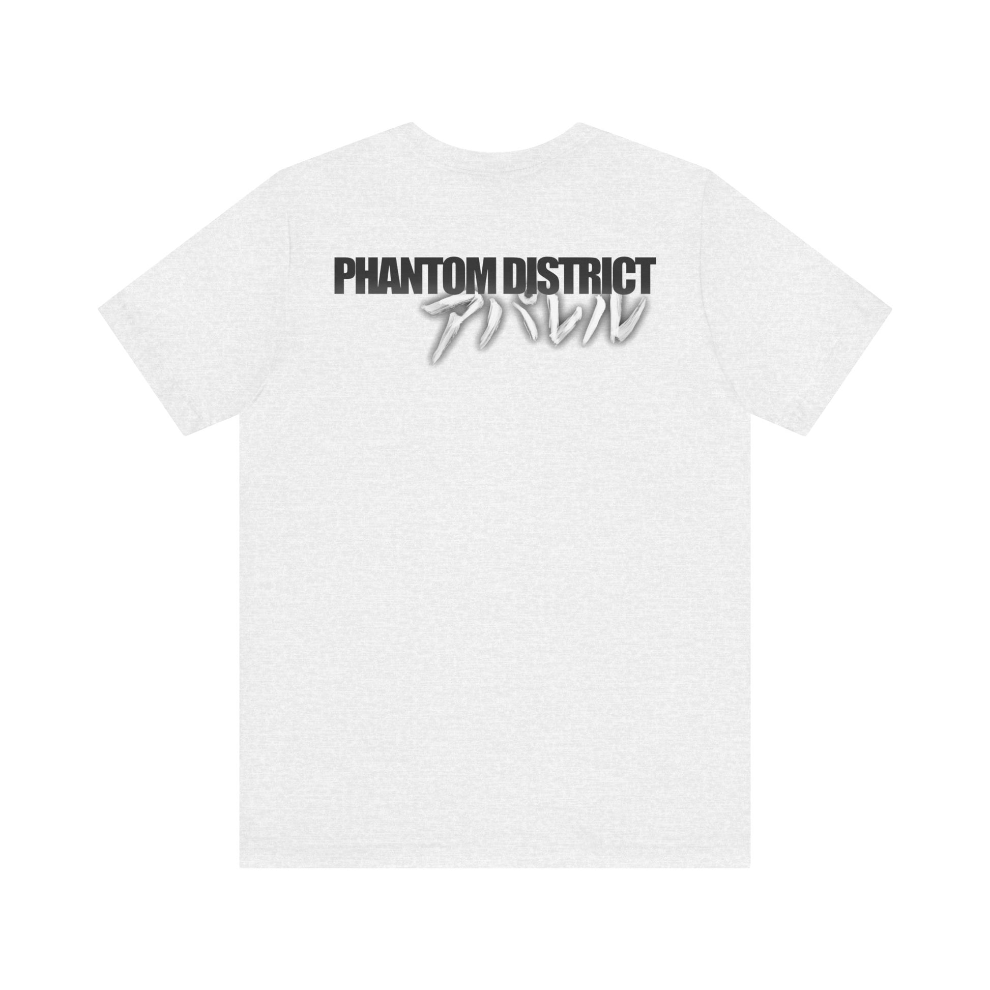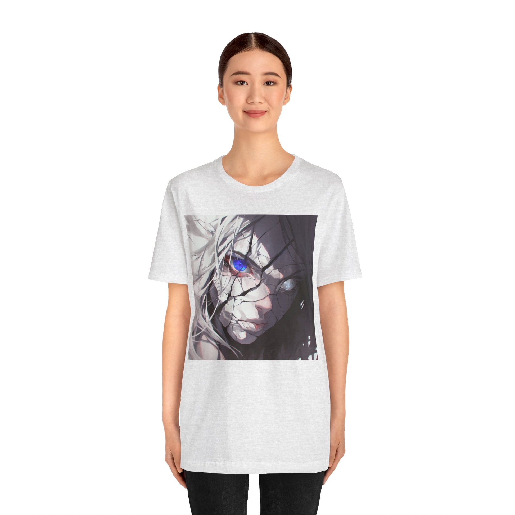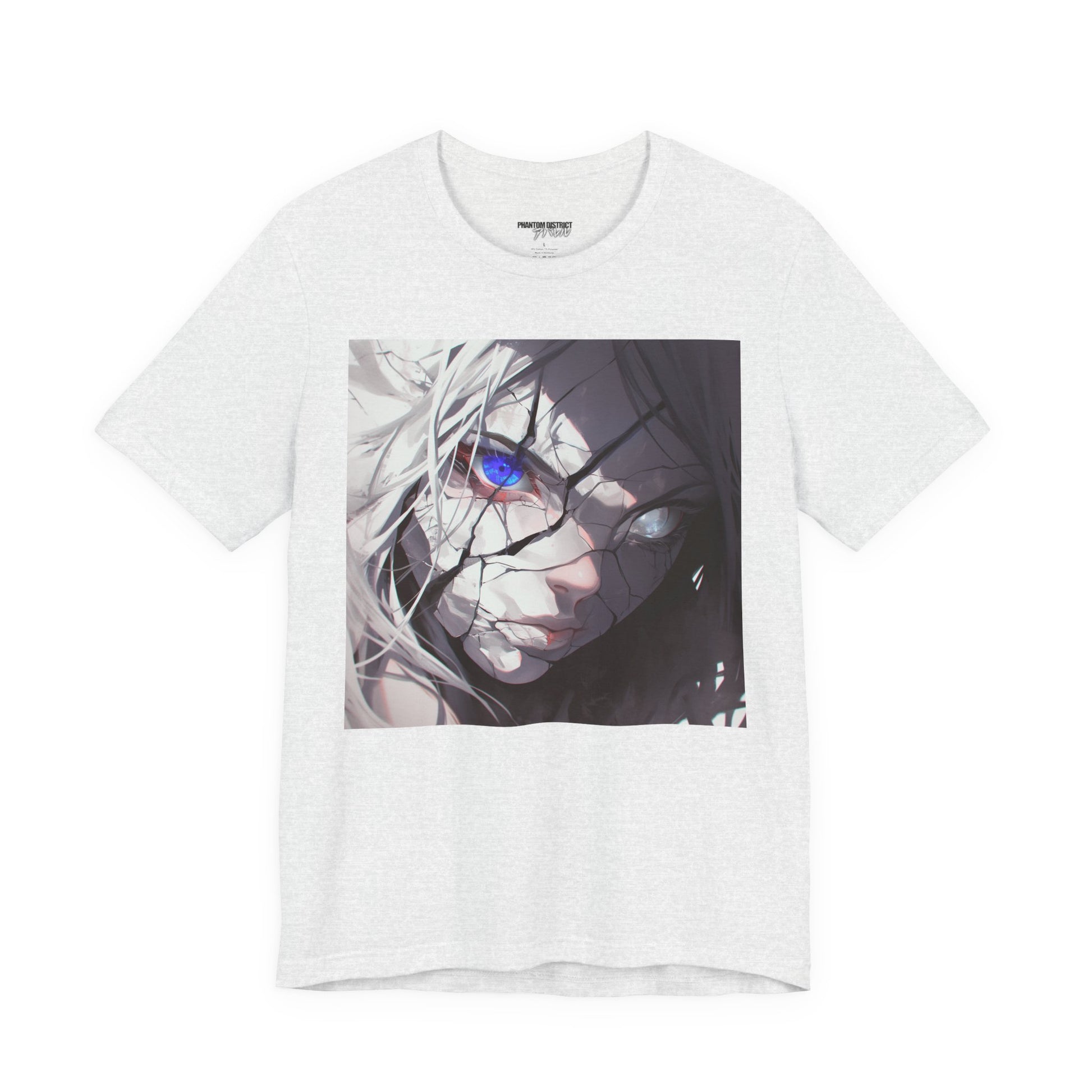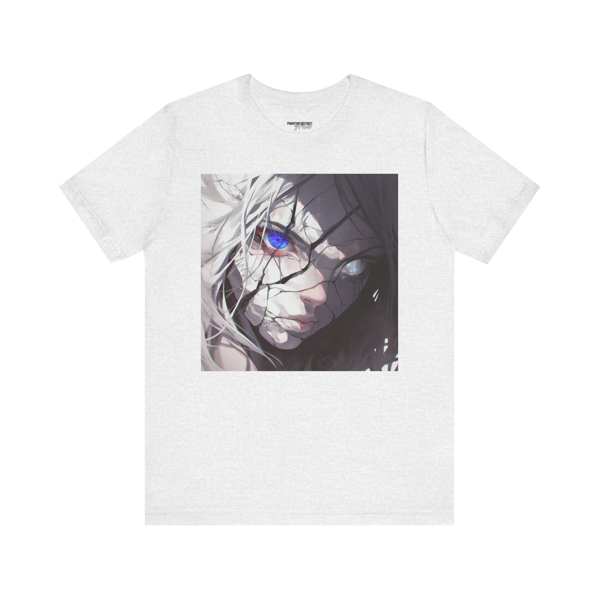 A lightweight, breathable jersey tee that brings a moody, close-up anime aesthetic into everyday wear. The front features a cracked, shadowed portrait with a single vivid blue eye cutting through the grayscale—an intimate, cinematic moment frozen in ink. On the back, layered “PHANTOM DISTRICT” typography with Japanese script adds an underground, modern-streetwear edge. The retail fit and classic crew neckline make it easy to layer under jackets or wear alone when you want your look to feel deliberate and expressive. Perfect for quiet sketch sessions, late-night walks, or low-key meetups with people who appreciate character-driven art.